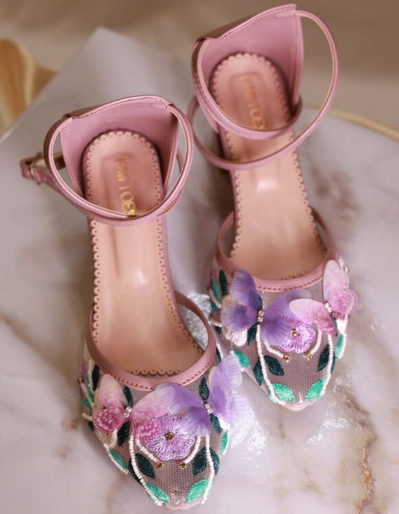 Make every step a statement with the Whimsy Walk Block Heels by Kiwi Toes. Designed with dual embroidered straps in contrasting green and pink, these heels showcase vibrant floral motifs that bring out a playful yet sophisticated charm.