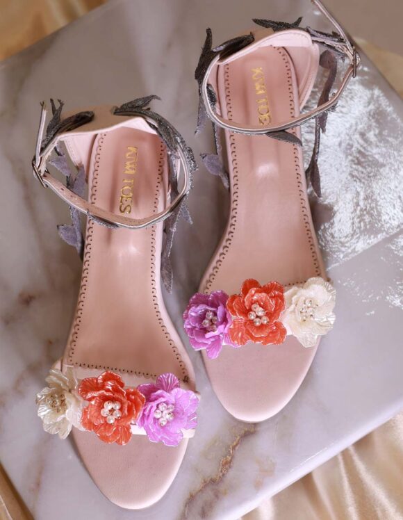 Embrace feminine charm with the Rosevine Block Heels by Kiwi Toes. Crafted in a soft nude base, these heels are beautifully adorned with 3D floral embellishments in shades of orange, purple, and white, each detailed with delicate pearls at the center.