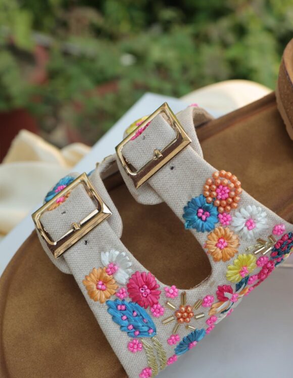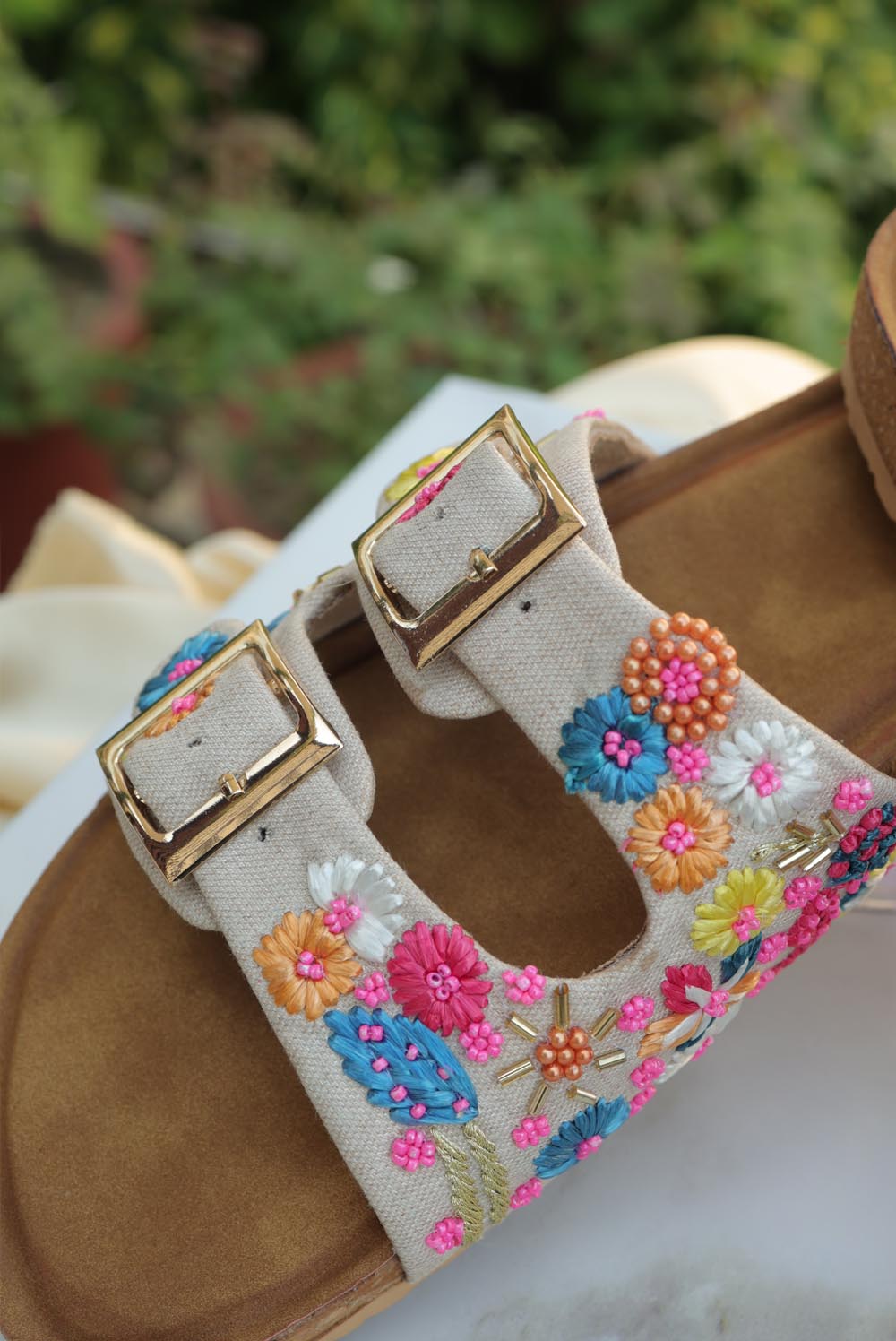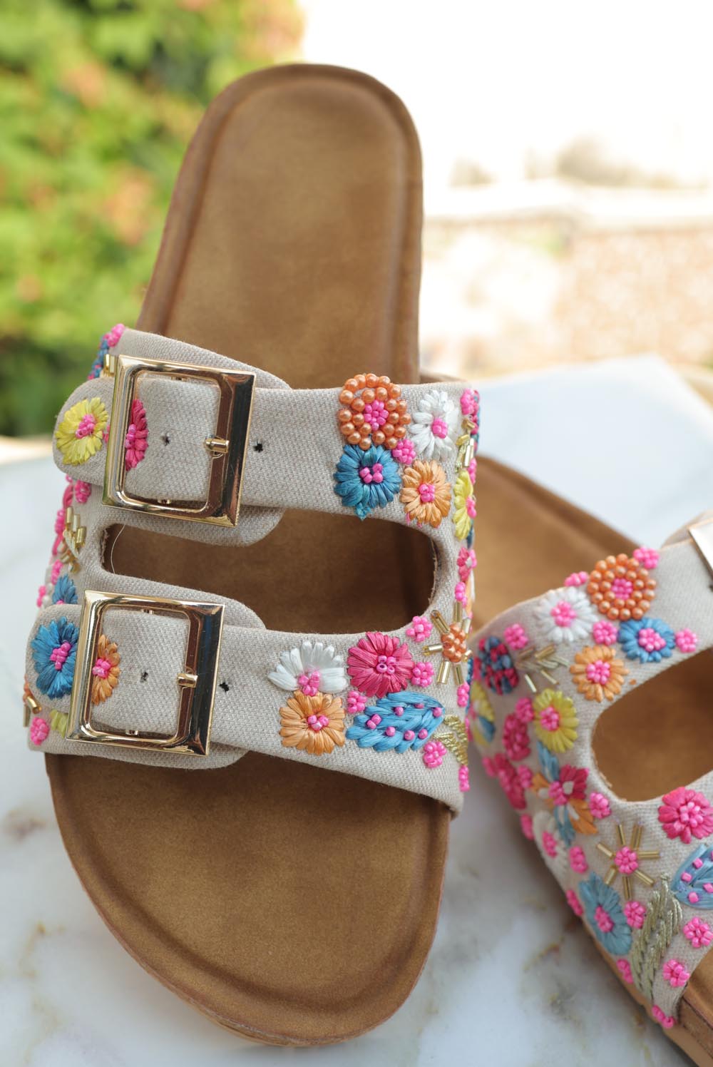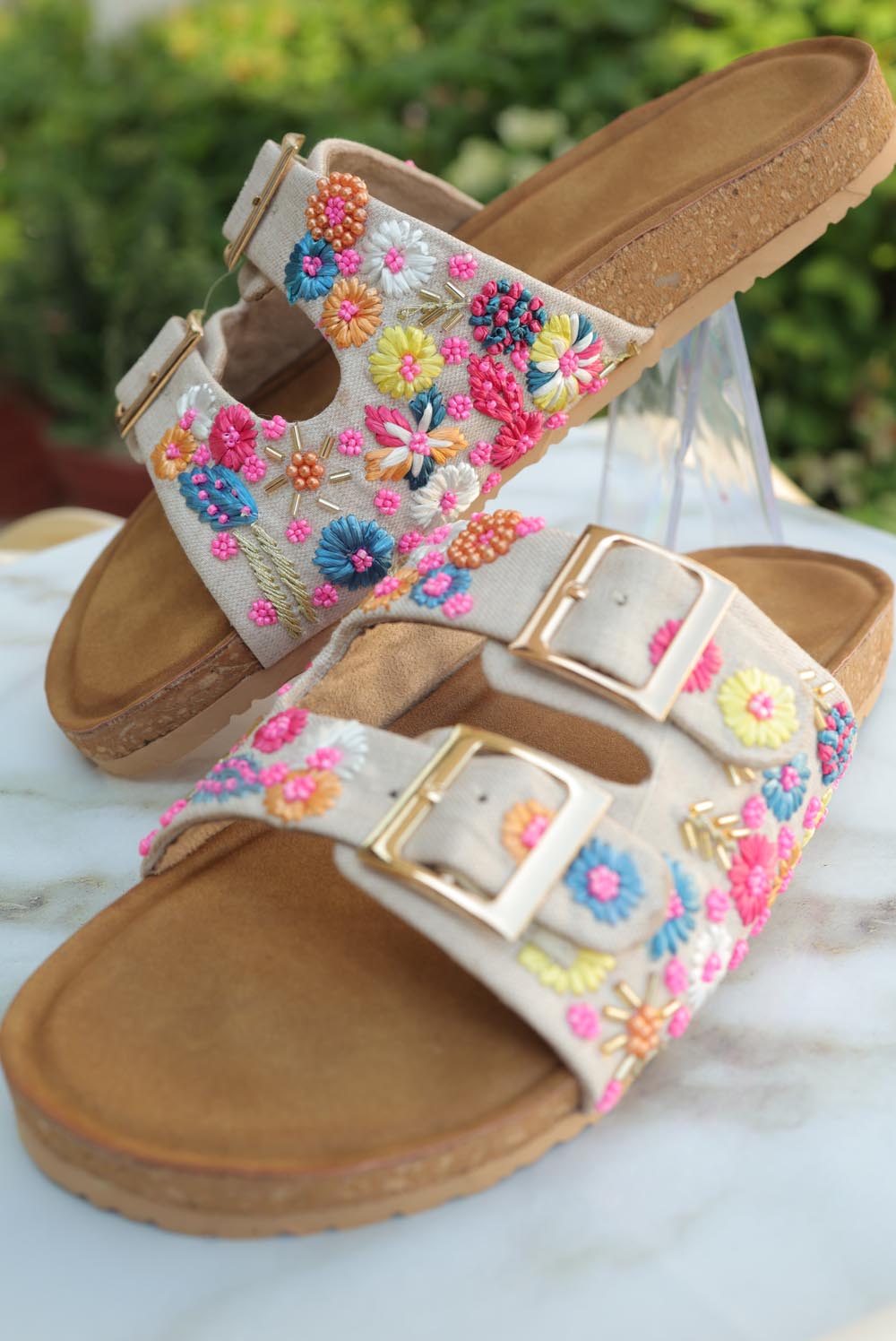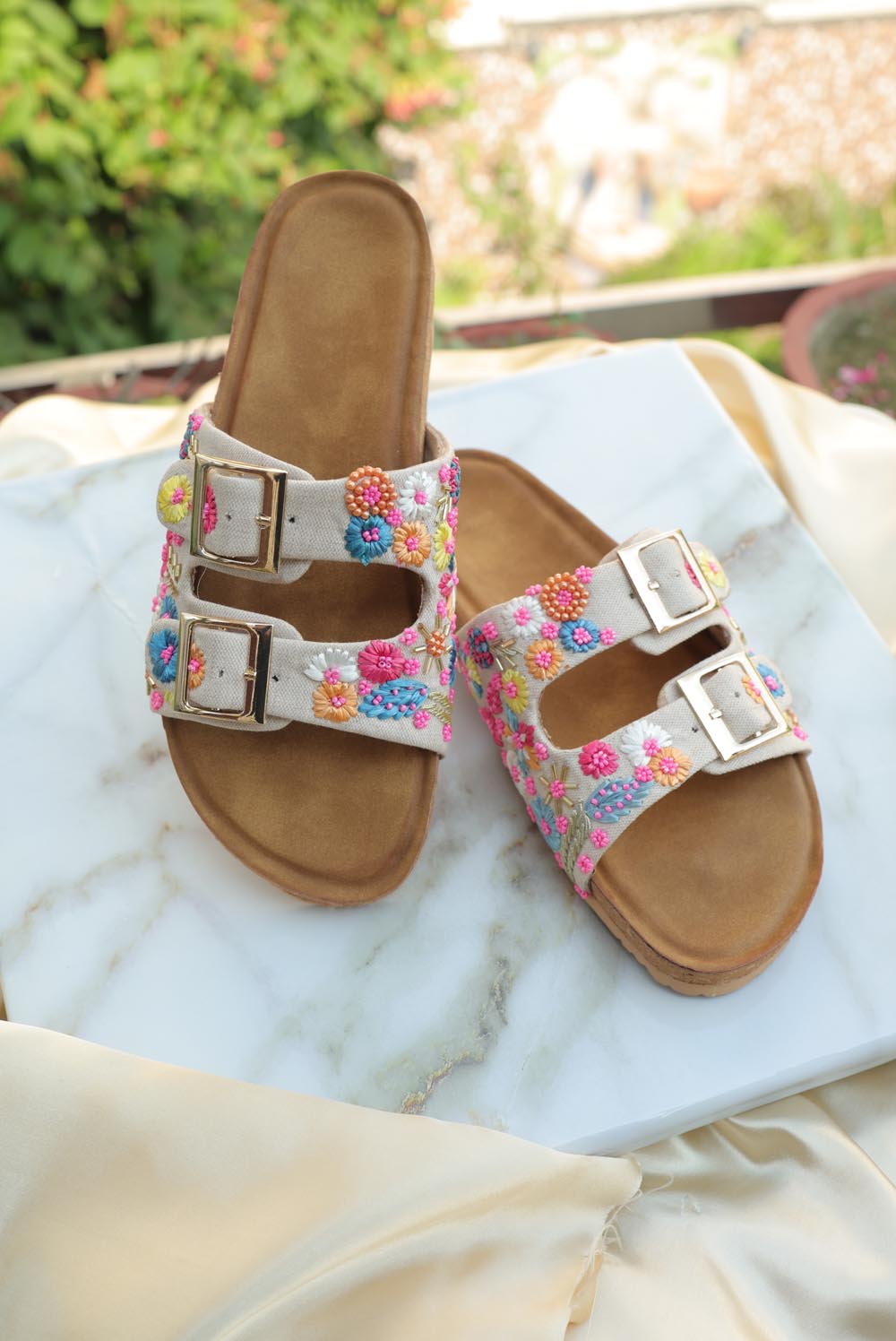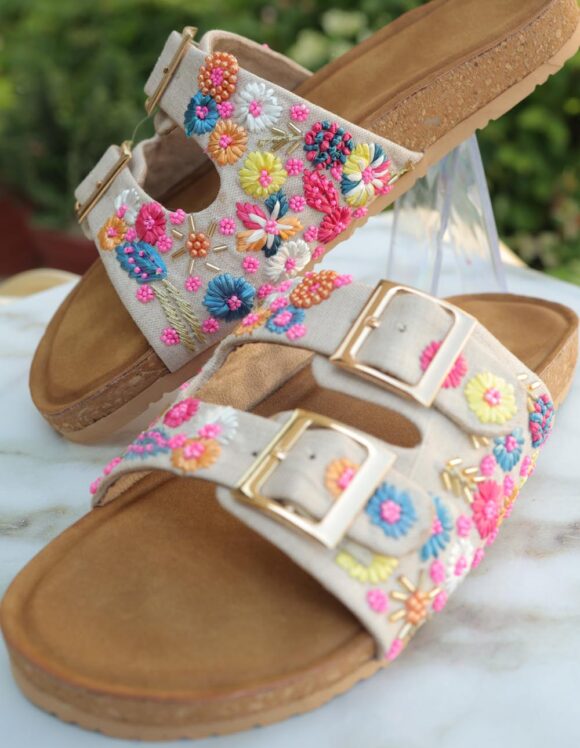 Bring style and ease together with the Blossom Comfort Sandals by Kiwi Toes. Featuring a chic double-strap design with adjustable buckles, these sandals are beautifully embroidered with multicolored floral patterns that add a refreshing touch to your everyday look. Crafted with a cushioned footbed and supportive sole, they provide all-day comfort while keeping you stylish.