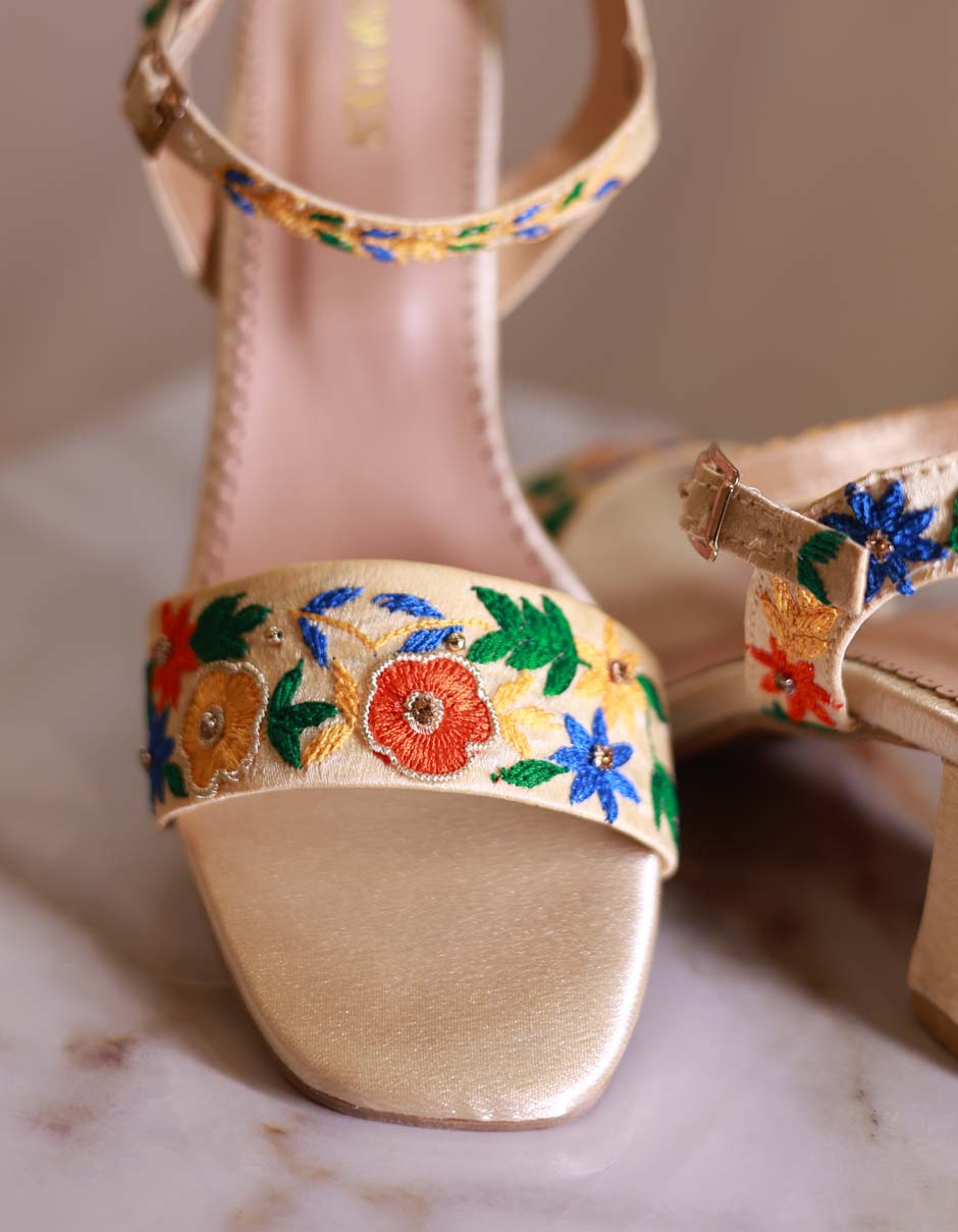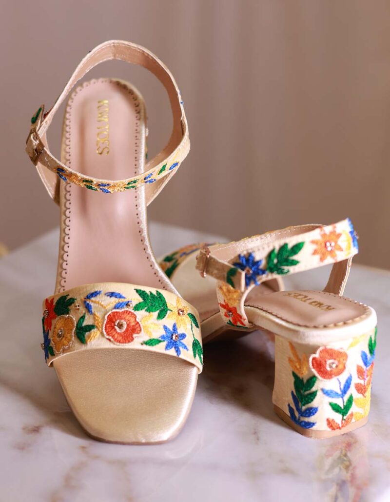 Brighten up your steps with the Ivy Trail Block Heels by Kiwi Toes, a perfect blend of elegance and vibrancy. Crafted on a soft beige base, these heels feature colorful hand embroidery with floral motifs in shades of red, blue, yellow, and green, bringing a fresh and playful charm.