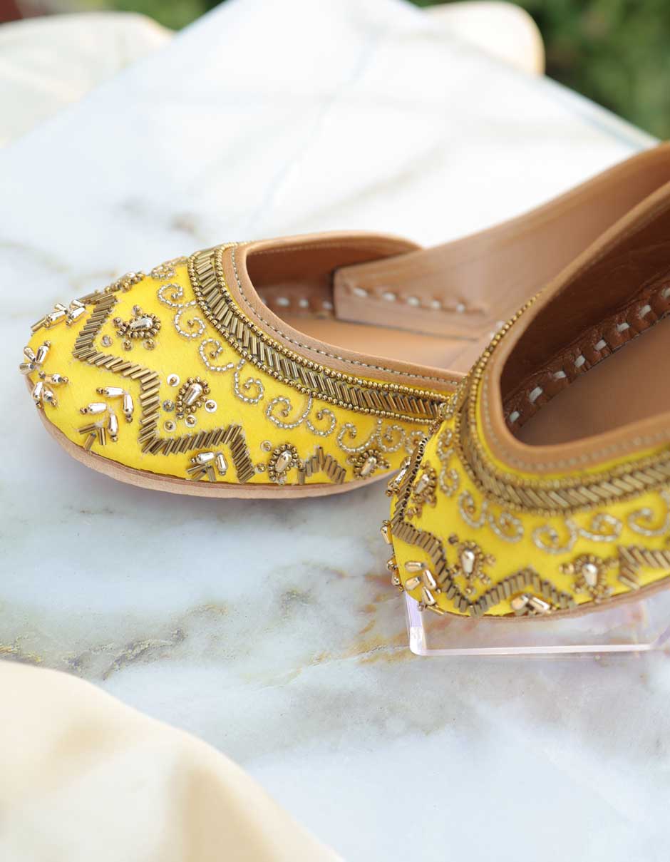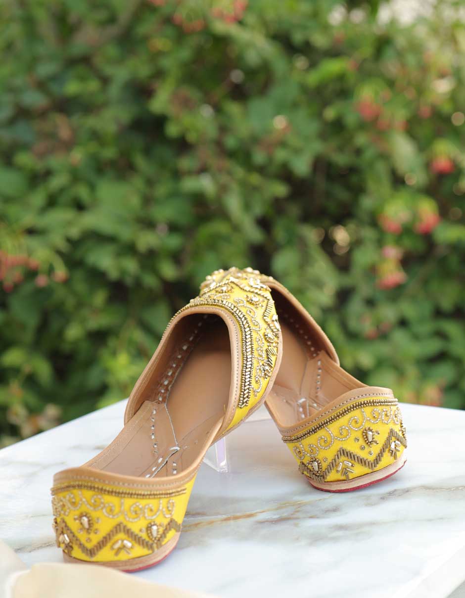 These handwork juttis showcase beautifully detailed motifs with fine zari and threadwork, creating a rich texture and graceful finish. The vibrant hue makes Leela ethnic design juttis a perfect choice for haldi ceremonies, festive celebrations, daytime weddings, and traditional gatherings.