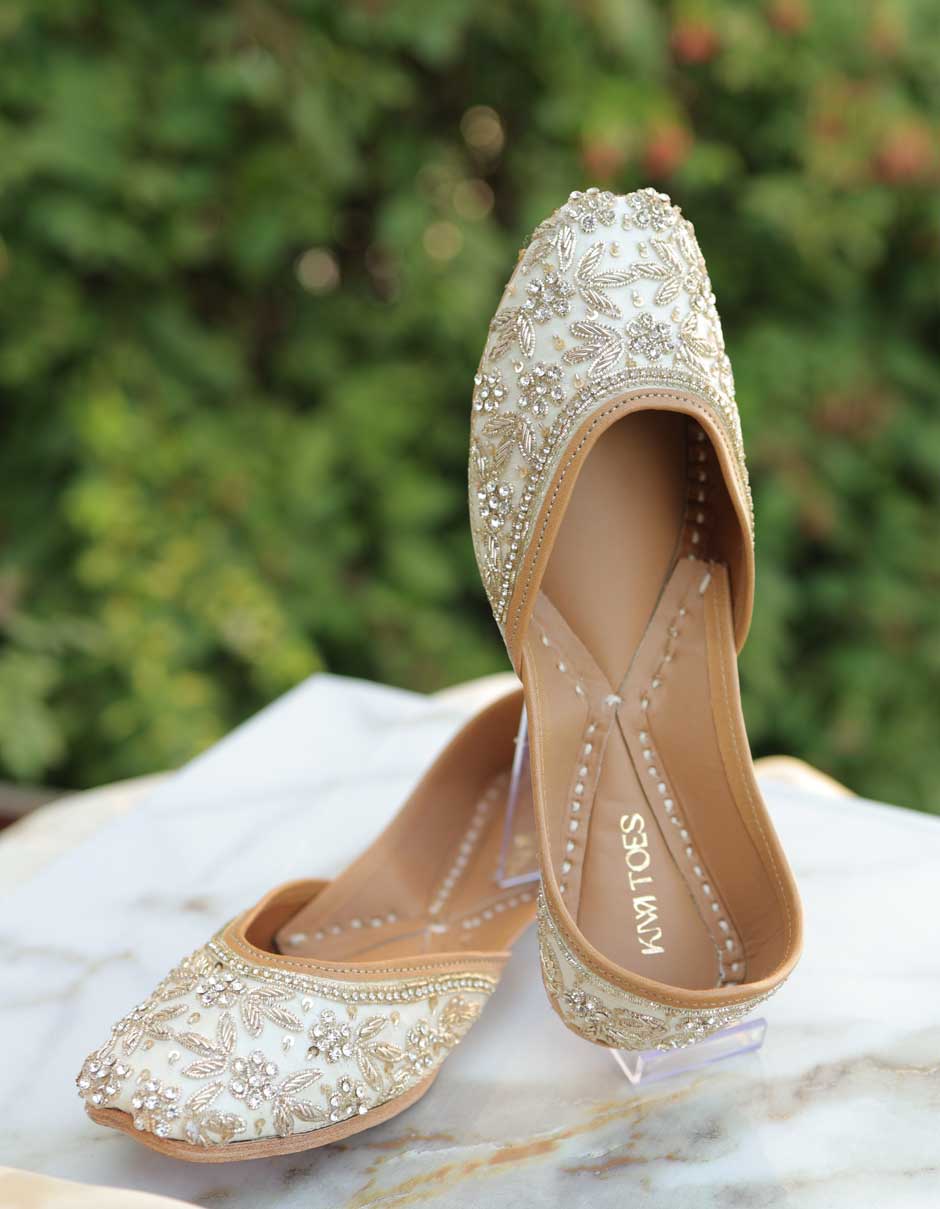 Radiate timeless elegance with Noor by Kiwi Toes, a beautifully handcrafted pair of ethnic juttis designed to complement graceful and luxurious looks. Featuring an ivory base adorned with intricate pearl, sequin, and zari handwork, these juttis exude a soft, regal charm perfect for special occasions.