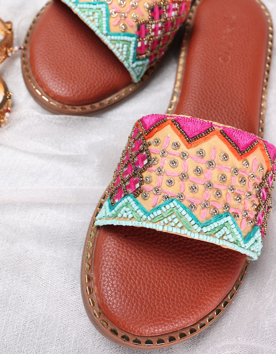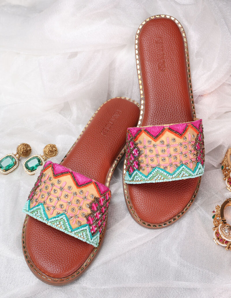 Make a bold statement with the Sugandha Flats by Kiwi Toes, crafted for those who love vibrant style with a touch of tradition. Featuring a striking multicolored pattern in pink, orange, and turquoise, these flats are hand-embroidered with beads, sequins, and mirror-inspired detailing for a festive flair. Set on a rich tan base with a cushioned insole, they balance comfort with eye-catching design, perfect for celebrations and chic everyday wear.