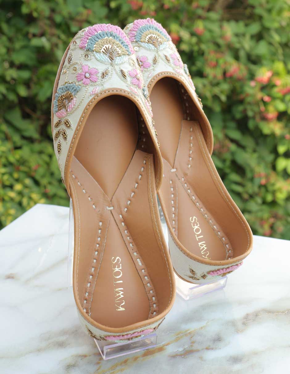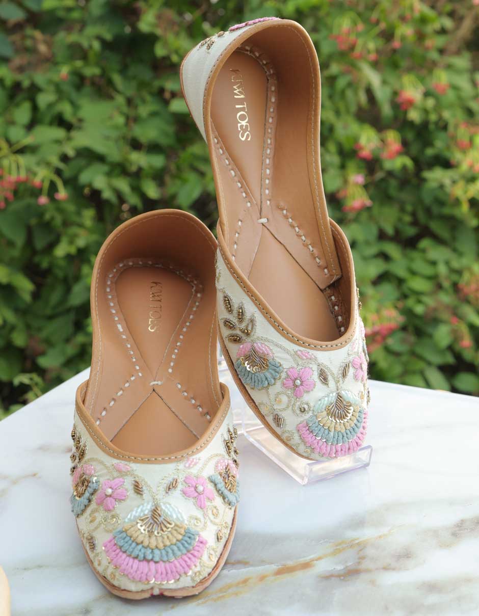Grace your ethnic style with Urvashi by Kiwi Toes, a delicately handcrafted pair of ethnic juttis designed to reflect elegance, charm, and refined craftsmanship. Set on a subtle ivory base, these juttis are adorned with intricate hand embroidery in pastel pink, powder blue, and soft gold accents, creating a graceful and feminine appeal.