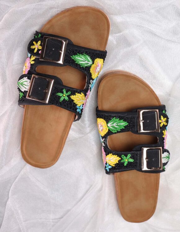 Make every step a statement with the Whimsy Walk Block Heels by Kiwi Toes. Designed with dual embroidered straps in contrasting green and pink, these heels showcase vibrant floral motifs that bring out a playful yet sophisticated charm.