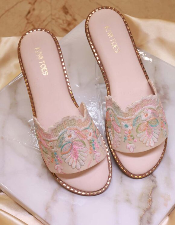 Make every step a statement with the Whimsy Walk Block Heels by Kiwi Toes. Designed with dual embroidered straps in contrasting green and pink, these heels showcase vibrant floral motifs that bring out a playful yet sophisticated charm. The sturdy block heel provides both height and stability, while the cushioned footbed ensures all-day comfort. A perfect fusion of modern design and artisanal embroidery, ideal for festive wear, parties, and chic everyday styling.