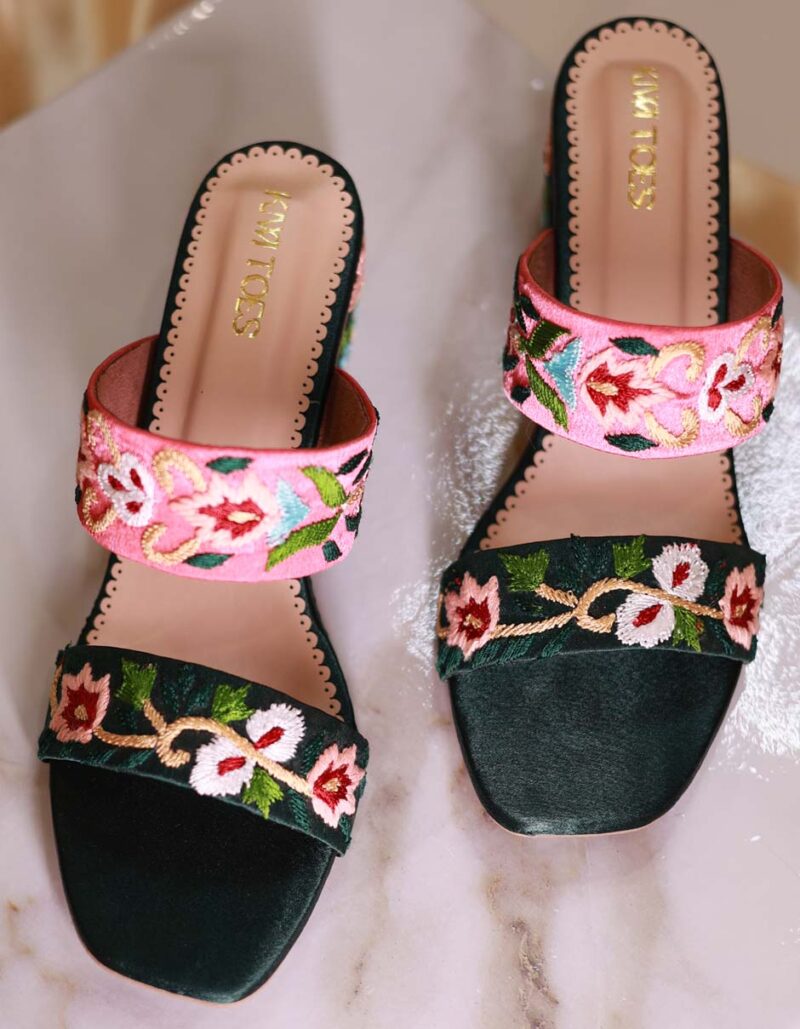 Make every step a statement with the Whimsy Walk Block Heels by Kiwi Toes. Designed with dual embroidered straps in contrasting green and pink, these heels showcase vibrant floral motifs that bring out a playful yet sophisticated charm.